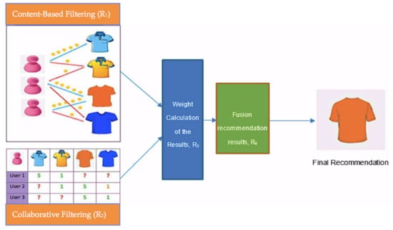 Viriato De Melo et al. proposed a content-based approach for clothing recommendation by combining textual attributes, visual features, and human visual attention in order to compose the clothes’ profile, which outperformed their baseline approaches []. The kNN algorithm is used for the item rating considering the past behavior of the user and the similarity between items.
