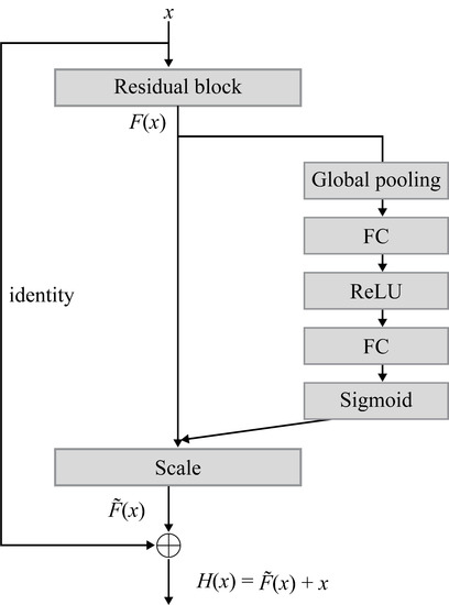 A single bottleneck block in the SE-ResNet model is demonstrated in Figure 3. Let denote the input data of the bottleneck block of the SE-ResNet model and denote the output data that have passed through the residual block. Then, assuming that includes feature maps. If the result of the squeeze step by applying global average pooling to is and the result of the excitation step by applying to is , transforms into as a channel-wise multiplication factor that acts as a scale factor to improve the feature discriminability. The output data of the SE-ResNet model bottleneck block become as is added to because of the shortcut identity connection. Therefore, if the loss function is , the following equation is established: