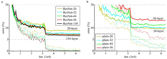 Therefore, the gradient calculated at the data input node may vanish to an extremely small value close to or diverge infinitely if the depth of the neural network is sufficiently deep. The ResNet and DenseNet models, which introduced skip connections, were developed to overcome this problem. In addition, SENets [22] were proposed to improve the representational power of CNN models. In the ResNet model, gradients do not vanish but are effectively transmitted when the weights are updated because there is a shortcut identity connection for each of the two weighted layers as in Figure 2, even in the case of deep neural networks. DenseNet can be considered a model that maximizes the idea of skip connections. In the DenseNet model, each layer is connected to all the other layers in a feed-forward manner, as in Figure 4. Therefore, each layer receives full output data from the previous layers. The DenseNet model effectively overcomes the gradient vanishing problem even when the depth of a neural network is deeper because of this feature. SENets model the interdependencies between the channels of convolutional features by introducing a squeeze-and-excitation (SE) block, which improves the representation power of CNNs by being plugged into various CNN models. In a performance comparison study of CNN models [18,22], the superiority was demonstrated in comparison to conventional models by calculating the accuracy of the trained models on several datasets (CIFAR-10 and ImageNet) and by comparing the number of parameters and the amount of computation (FLOPs) required for forwarding a single input image. He et al. (2016) measured the top-1 error rate performance of ResNets and plain networks composed of the same rules as the VGGNet model on the ImageNet validation set. He et al. (2016) have verified that ResNet reduces the top-1 error rate compared to a plain network on an extremely deep system, as shown in Table 1. He et al. (2016) also measured the training and testing error rates of plain networks and ResNets on the CIFAR-10 dataset and verified that ResNets have accuracy gains compared to plain networks when the depth increased, as shown in Figure 5. Hu et al. (2017) measured the single-crop top-1 and top-5 error rate performance of ResNets and SE-ResNets on the ImageNet validation set. Hu et al. (2017) have verified that SE blocks consistently improve the error rate performance across different depths with an extremely small increase in computational complexity, as shown in Table 2 and Figure 6.