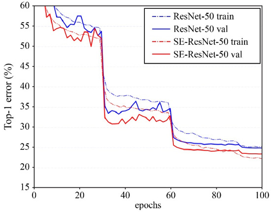 The performance in terms of the top-1 error rate, top-5 error rate, and amount of computation (GFLOPs) needed in the ResNet and SE-ResNet models for the ImageNet dataset when the number of weighted layers is 50, 101, and 152 is summarized in Table 2 [22]. A graph showing the change in the top-1 error rate based on the epochs of ResNet-50 and SE-ResNet-50 is depicted in Figure 6, which shows that the validation of the top-1 error rate of SE-ResNet-50 is lower than that of ResNet-50 [22]. Although the amount of computation needed for the SE-ResNet model with the SE block plugged into the ResNet model slightly increased, the top-1 and top-5 error rates were lower than those of the ResNet model, as presented in Table 2 and Figure 6. This was consistent with the result of the gradient flow analysis, in which it can be seen that the SE-ResNet model was more likely to effectively overcome the gradient vanishing problem than the ResNet model.