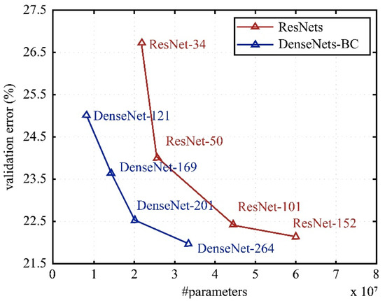 Figure 7 depicts a graph showing the number of parameters of ResNet and the performance of the validation for the top-1 error rate for ImageNet when the number of weighted layers is 34, 50, 101, and 152. It also shows the number of parameters of DenseNet and the performance of the validation for the top-1 error rate for ImageNet when the number of weighted layers is 121, 169, 201, and 264. Although DenseNet-201 has fewer parameters and more weighted layers than ResNet-50, the validation top-1 error rate of DenseNet-201 for ImageNet was lower than that of ResNet-50 as it overcomes the gradient vanishing problem more effectively.