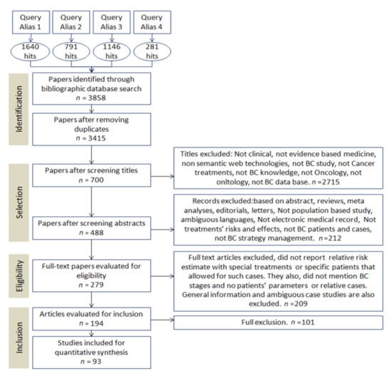 First, duplicates were removed. Then, we focused on checking the titles and abstracts. This helped us to reduce the number of articles to 279 to refine the set of records gradually. In this screening phase, we found that there were many papers discussing cancers, and general knowledge about treatments such as numbers and statistics. However, few of these papers reviewed the risks and effects of BC treatments regarding evidence-based medicine and semantic web technologies. Moreover, we only considered articles that strongly focused on providing data about BC patients and cases, which was our main concern in this information gathering. We also focused on knowledge acquisition. We mainly excluded research that did not include examples and patients’ parameters and characteristics related to BC treatments. Only 93 remaining papers and records met the criteria to be included for quantitative synthesis and utilization as medical evidence and cases.