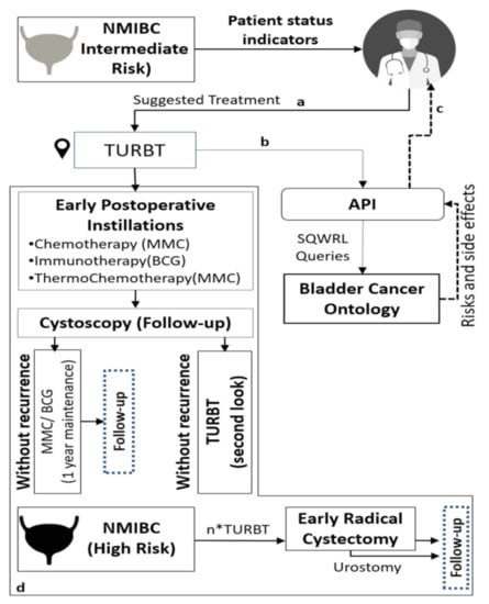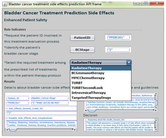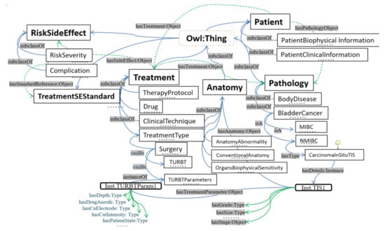 Following a patient’s discovery of BC, the care team develops a personalized treatment plan. This is based on the patient’s health and specific information about cancer. When deciding which treatments are to be offered, consideration is given to the stage, grade, risk category, functional index, and other medical conditions that affect the patient and the preferences of the patient concerned. The different types of possible treatment for this pathology include surgeries and in particular Transurethral Resection of the Bladder Tumor (TURBT), Cystectomy and Pelvic lymph node dissection, among the popular treatment options. Immunotherapy, Chemotherapy and Radiation therapy are also common practices for the treatment of BC []. However, these procedures have many side and unwanted effects including mouth sores, tiredness, changes in kidney or liver function, diarrhea, dry mouth, changes in fingernails or toenails, changes in mineral levels in the blood, loss of appetite, loss of taste, anemia, dry skin, dry eyes, and hair loss, along with redness, swelling, peeling or tenderness on the hands/feet, constipation, belly pain, nausea, and muscle pain. In addition, eye problems can occur. These include blurred vision, loss of vision or other visual changes. In most cases irritation and a burning feeling in the bladder occur, along with blood in the urine []. SEs will vary in type and severity depending on the administered treatment and on the medical case of each patient. Our aim is to capture and provide the right knowledge for a computer agent to assist the doctor during the process of treatment prescribing by deducing the possible SEs for a selected treatment type, applied to a specific medical case of a patient suffering from a BC case.