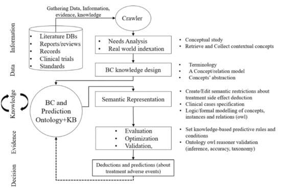 In this study, we used a crawler “pubCrawler” as a selective information dissemination service (SDIS) to extract information from various online knowledge sources, particularly evidence-based knowledge and data about past events and facts in BC treatments. This systematic review framework was applied to search, extract, and assess scientific papers. We used a keyword search strategy to find relevant articles that contain knowledge about BC treatment risks and effects and research about BC ontologies. Journals, books, guidelines, and taxonomies are also included in these crawling events. Additionally, research was applied to find clinical anonymized and non-identifiable data and indications about patients and related clinical cases used in previously published studies about BC. Whether a study refers to random samples or is broadly applicable to many different types of samples, data are labelled with good generalizability.