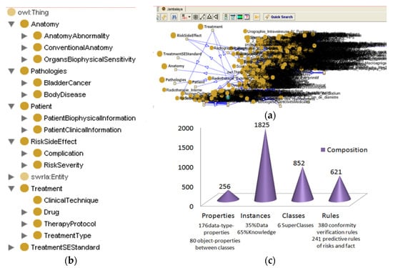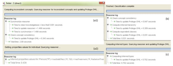 We have also used many features of OWL that could be found in the world wide web consortium reports and Jain et al. [,]. These include enclosure, intersection, union, inverse, and equivalence (of classes and properties). All these elements were created to identify the quantitative assessment model and predictions generated by our knowledge-based approach.