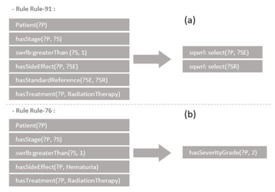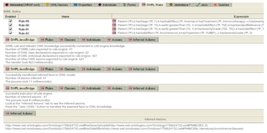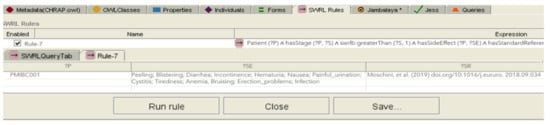 Based on the given conceptualized domain vocabulary (as provided by our OWL2 ontology in the previous section) and an extended syntax with logic-based descriptions, we can produce sets of decision support rules using the semantic web rule language (SWRL) []. As an OWL-DL based language combined with Horn-like logic rules of the rule markup language (Rule-ML), this is used for developing rule-based approaches. The rules assessment and firing tasks were passed to the rule engine (Pellet 2) []. This engine played the role of a deductive system which, starting from formulas of the language chosen as premises (axioms already represented in the ontology), made it possible to construct new formulas in the form of new premises to be added to the ontology. The newly generated knowledge by the rule engine will be offered to medical practitioners as decision support guidelines. The set of rules are run in a query-like mode of knowledge reasoning and retrieval. In this sense, a condition that is tested by the first part of a rule is true if its query is valid. For example, “All patients who are taking external beam radiation therapies are at risk” can be written as:
