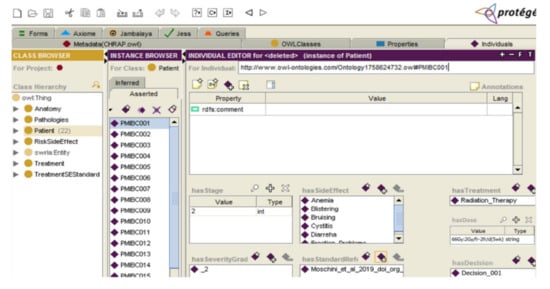 In the literature, only a few works focus on the application of information technology to optimize oncotherapy treatment processes. To the best of our knowledge, no effort has been put into the relationship to BC oncology. In general, the research effort has been directed to the construction of medical ontologies [,], as well as the translation of many existing thesauri, terminologies, and classifications into the ontology web language (OWL) [,]. Beyond the construction of ontologies, some works aimed to exploit the potential of the semantic web in medical and clinical applications: for example, computerized patient records [] or knowledge management in clinical processes []. So far, several studies have attempted to suggest predictive computer approaches and models that are based on mathematics, semantics and logic for use in health systems, e.g., the probabilistic models [,,], the Bayesian network [] and the rule-based therapeutic recommendations for infectious diseases []. These approaches were welcomed at first, but studies have revealed some major inadequacies [,]. This is mainly due to the presentation of results in the form of probable treatments with their consequences, but without explanations. These approaches did not convince doctors particularly in the case of probabilistic approaches since they are not able to say explicitly “why” and “how” they produced such results. In contrast, the semantic modelling in association with the rule-based reasoning we provide in this work allows us to identify patients at high risk of oncotherapy SEs in the case of BC. This has also permitted the development of computer-based prediction of treatment for SEs while taking into consideration medical proof and evidence specified as contextual information within our ontology.