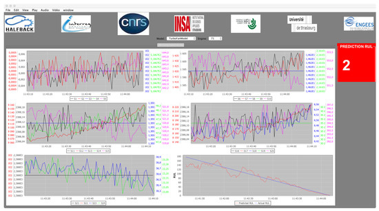 Whereas [17] considered only 10 arbitrary test sequences, we use a random train–test split. The first 70 sequences are used to build a model, using LSTM [50]. The remaining 30 sequences are used as a test set. Figure 4 illustrates the used architecture. A fixed window length is defined and used to train the LSTM. A data normalization process is applied on all time series. In LSTM, the hyperbolic tangent is used as the activation of hidden neurons and the sigmoid for the gates. All features are used for training, due to the ability of LSTM to deal with non-relevant features. After trying other existing optimizers, an adamax optimizer is retained by experiments to fit the best model. Then, a dropout function is used between layers to prevent over-fitting. Finally, the last dense layer estimates the remaining useful life of the tested turbofan engine. The hyperparameters were set by preliminary experiments on a few sequences of the training set until the predictions successfully converged to a detection of the failure. In future work, cf. Section 6, we plan to favor underestimations over over-estimations, and to optimize the fitting near the duration needed to plan and perform the maintenance. Figure 5 contains a screenshot of the prediction software we implemented.