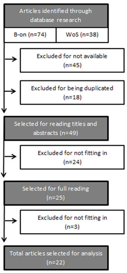 Often reading the title and the abstract is not enough to recognize the true relevance of an article, so it is essential to analyze the introduction and conclusion as well. These steps are intended to ensure the selection of the most relevant and of high-quality articles for the study that follows. Twenty-five documents were selected for a full reading. After this analysis, 3 articles were removed for not containing either conclusions or appropriate methodology for analysis. The total number of articles selected for the study was 22.
