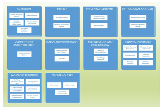 Taking real ecosystems of applications implanted in large clinical centers as a reference, we could isolate a generic list of applications and information systems to work with, as shown in Figure 3, Figure 4, Figure 5 and Figure 6. Thus, the information systems used by each clinical area are presented, as well as those information systems of transversal use.