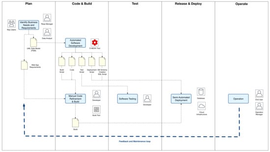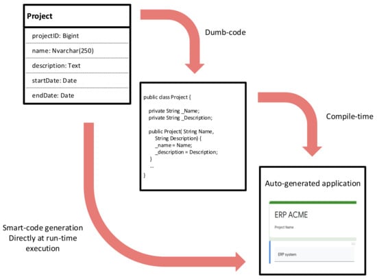 Increasing the level of automation throughout the application lifecycle is addressed by model-driven development approaches, which enhance the advantages of a traditional model-based approach (e.g., improved quality, enhanced communication and stakeholder engagement, increased productivity, enhanced knowledge transfer, and reduced risks) and also introduces appropriate model transformation for generating refined models and executable code from abstract models []. The adoption of such approaches leads to a different use of models that are no longer used only for specifying the system to be developed, but also to actually play a productive role in the development process.