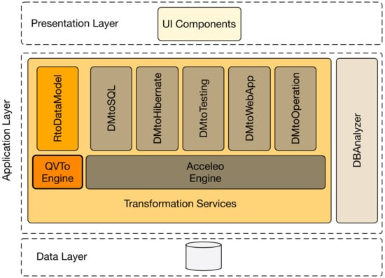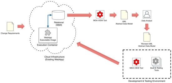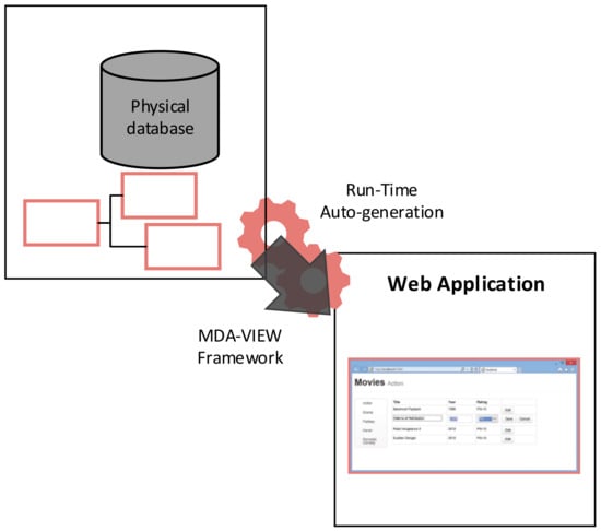 Finally, as mentioned in Section 1, it is worth noting that E-MDAV extends the MDA-VIEW framework illustrated in a previous contribution []. The MDA-VIEW framework focuses on the automated generation of a web visual interface to an existing database. Thus, MDA-VIEW requires an existing database implementation from which a data model is first derived and then used for driving the generation of the web application code. In this respect, MDA-VIEW does not provide any support for ensuring the consistency among the several artifacts and between the model and the application. Differently, E-MDAV provides a complete MDA-based methodology that fully supports the development and maintenance of data-intensive web applications, taking into account both the forward- and the reverse-engineering processes. The E-MDAV framework exploits a model transformations chain that significantly reduces the effort required for the generation and configuration of the target web application, ready to be deployed onto a cloud-based platform. E-MDAV has been inspired by DevOps’ principles, to reduce the gap between development and operation stages and thus enact frequent release cycles. Moreover, differently from MDA-VIEW, the E-MDAV implementation is fully based on open-source technologies. Further details which clarify how E-MDAV overcomes the most relevant limitations of the previous MDA-VIEW framework are provided in Section 5.1 and Section 5.2.