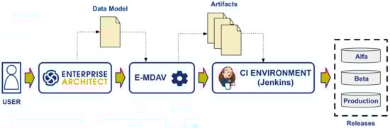 In both scenarios, the application development provides the opportunity to exploit a DevOps process that can be implemented by using a Continuous Integration (CI) environment, such as Jenkins. In such a case, the data model, which is developed by use of an appropriate tool (e.g., Enterprise Architect) constitutes the main input given to E-MDAV. The artefacts generated by the E-MDAV tool (as discussed in Section 5) are given as input to the CI environment, which is charge of enacting the CI pipeline and handling the various releases (e.g., alpha, beta and production), as outlined in Figure 11.