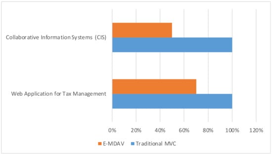 Finally, Figure 14 compares the effort required for developing the addressed applications in the above-mentioned cases: adopting a traditional MVC approach (blue bar) or adopting the proposed E-MDAV frawework (orange bar).