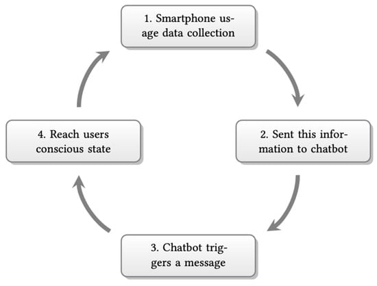 Chatbots are becoming known for their benefits, e.g., they are always available to perform a task that otherwise would not be possible or would take a longer time; they are also characterized by their correctness and impartiality []. This is because chatbots play an important role when the user wants to learn or develop skills in a language, for customer service in e-commerce websites, or for entertainment purposes [,]. However, they are not yet considered an ideal solution for smartphone overuse [].