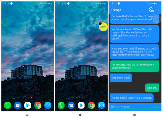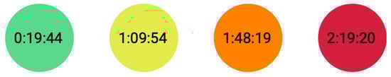 In addition, the floating widget is also used to share the total time spent on the smartphone. For this reason, the user can define the maximum usage time they would like to spend as a goal in the app (this information is considered by the chatbot to raise user awareness), where its color changes accordingly, as Figure 3 shows. It can also be dragged to any corner of the screen, and during inactivity its transparency is set to 80% so as not to disturb the user while using other apps. This feature reveals itself as important since previous research has pointed out that users tend to agree with the idea of helping them regulate their usage style [].