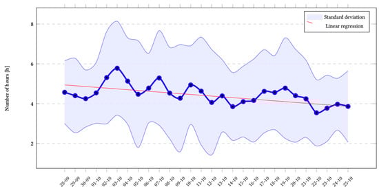 Average usage data, for each user, filtered by day. It is possible to observe that the linear trendline decreases, which indicates a reduction of smartphone use over the time. Filled blue areas as standard deviation.