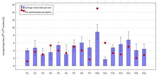 Average usage data, for each user, filtered by day, compared with their perception after filling the pre-questionnaire.
