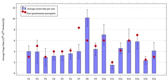 Average usage data, for each user, filtered by day, compared with perception after filling the post-questionnaire.