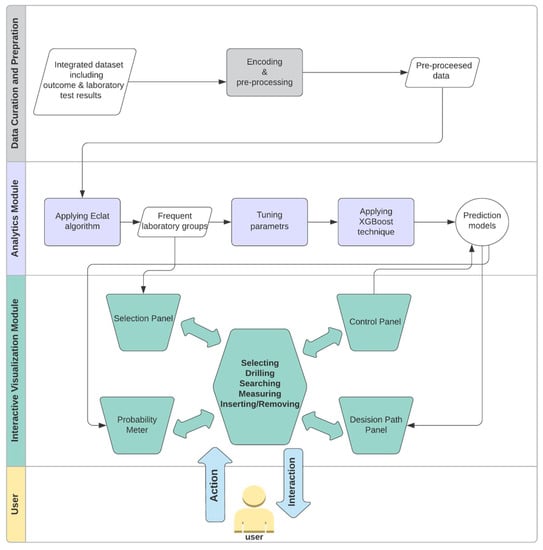 Accurate and early clinical diagnoses play an important role in the successful treatment of diseases. Every disease stems from or causes changes at a molecular and cellular level, and some of these changes can be detected through changes in urine and blood parameter values []. Patterns within laboratory test results may contain additional information relevant to patient care that are not detected or appreciated by even the most experienced physicians [,]. Laboratories typically report test results as individual categorical and numerical values, but some individual results, particularly when studied in isolation, may have limited clinical value. Physicians often integrate several individual tests from a patient and interpret them in the context of medical knowledge and experience to use them for disease diagnosis and management. Furthermore, patients might have many individual tests, spanning years. There is a higher chance of overlooking important patterns in the increasing numbers of parameters that laboratories measure. While the manual approach to test interpretation is the routine procedure in most cases, data analytics offers the potential to improve the laboratory tests’ diagnostic value []. Several studies have been conducted to develop risk prediction models using laboratory test data, and some of these models were developed using data analytics techniques [,,,,,,,,,,,,,,]. These studies rely solely on performance metrics, such as high accuracy scores, to assess model performance. Furthermore, due to their unclear working mechanisms and their incomprehensible functions, the analytics techniques used in these studies are often treated by users as black boxes. Therefore, the question arises whether the user can trust these analytics techniques or not, especially in medical settings, where the model makes a critical decision about patients [,]. One way to increase the model’s interpretability is by getting the user involved in the analytics process through an integrated approach called visual analytics [,].