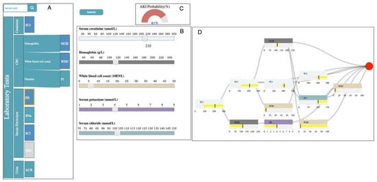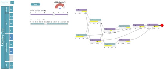 As shown in Figure 3, the laboratory tests are classified into four categories: Creatinine, Complete Blood Count (CBC), Serum electrolyte, and Urine. Creatinine refers to SCr. CBC is composed of HGB, WBC, and Pl. Serum electrolyte contains SNa, SK, SBC, and SCl, and Urine includes ACR. Now, let’s assume the user is interested in exploring the relationship between SCr, SK, SCl, and AKI. The user can first select the rectangle corresponding to serum electrolytes to open it up and observe the full laboratory names included in that group and then select the rectangles corresponding to SCr, SK, and SCl in the selection panel. Upon selection, the system inserts a slider corresponding to the chosen test in the control panel. The system allows the user to probe the prediction model by generating input examples for their chosen tests using sliders in the control panel. As shown in Figure 3, the user has selected the SCr value of 70 umol/L, SK of 4 mmol/L, and SCl of 102 mmol/L through corresponding sliders. Upon submission, the analytics module uses the XGBoost model, generated with the subset of data, including SCr, SK, and SCl, to predict AKI with the input values and returns the result to the probability meter and the decision path panel. The probability meter in Figure 3 shows that the probability of developing AKI, for a patient with the chosen values for SCr, SK, and SCl, is 22 percent.