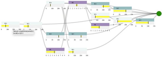 To ensure that the prediction is reliable, the user examines the decision path panel to check the result (Figure 4). As shown in 4, the user can observe that SCr is the only feature that appears in the first and second layers. Since we expect features near the root of the path to be more important than features near the leaves, SCr has higher importance than SCl, and SK when predicting AKI, given the input. If the user hovers the mouse over the SCr feature node in the root layer, they can see the split threshold for that specific node (i.e., SCr > 121.1 umol/L). This information can guide the user to observe how the probability of developing AKI changes if they increase the SCr from 70 to 140 (i.e., a value greater than 121.1 umol/L for SCr). Figure 5 shows that the AKI probability is risen to 68 percent by increasing the SCr value. The user, then, might be curious to explore the association between SK, SCl, and AKI. In this case, they can click on SCr rectangle in the selection panel to remove its corresponding slider from the control panel. Let’s assume the user wants to observe how the changes in SK level would affect the probability of AKI. If the user increases SK to 6 mmol/L (high potassium level), the probability of AKI becomes 80 percent (Figure 6). The user can then observe the feature ranges and the path that led to this probability. For instance, they can observe that the split points for SK are around 4.7 to 5.1 mmol/L, which suggests that this range is critical when using SK in predicting AKI. They can also observe that SK and SCl have similar importance in AKI prediction based on the order they appear on the decision path.