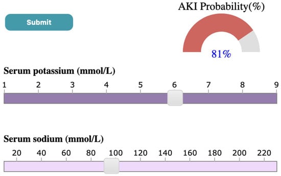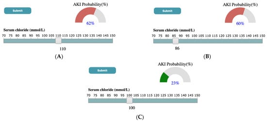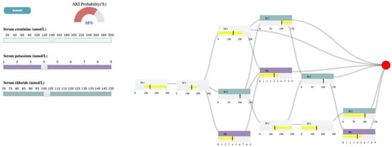 Through a case study using the ICES-KDT dataset, we have shown that outputs generated by SUNRISE are consistent with what has been found in the literature. For instance, Chen et al. [] has shown that higher serum potassium and lower levels of serum sodium were more likely to lead to the development of AKI. A similar output is observed in results generated by our system. As shown in Figure 7, in the case study presented in the paper, if the user selects SK value of 6 mmol/L and SNa of 96 mmol/L through corresponding sliders, upon submission, the probability meter shows the probability of developing AKI for a patient with the high value of SK, and low levels of SNa is 81 percent. Another example can be seen in Figure 8, where a low serum bicarbonate level (16 mmol/L) is shown to be significantly associated with the development of AKI (74%) while a normal serum bicarbonate level (26 mmol/L) is less likely to progress to AKI (43%). A similar association has been shown by Lim et al. [], where patients who have low serum bicarbonate levels are estimated to develop AKI 1.57 times the patients with normal bicarbonate levels. According to the study done by Oh et al. [], the incidence of AKI was significantly higher for patients with high and low serum Chloride levels compared to patients with normal chloride levels. As shown in Figure 9, a similar conclusion can be reached using SUNRISE. When the user selects a high chloride level of 110 mmol/L (Figure 9A) or a low chloride level of 86 mmol/L (Figure 9B), the probability of development of AKI is 62% and 60% consecutively, which are significantly higher than the probability of developing AKI (23%) with normal chloride levels (Figure 9C). Several studies have shown the association between lower hemoglobin, which is frequent in hospitalized patients, and AKI [,]. A similar outcome is generated using our tool. As shown in Figure 10, a low hemoglobin level (64 g/L) is shown to be significantly associated with the development of AKI (82%), while a normal hemoglobin level (166 g/L) is less likely to progress to AKI (22%). In addition to these examples, there are many other hypotheses that can be generated from the results of the system. Although most of them are aligned with theories from medical literatures, some of them have not been studied yet. This is especially true for combinations of different test results and their associations with the outcome. SUNRISE can be used by domain experts to identify such hypotheses, which can further be verified through formal clinical studies. It is important to note that the system can be used with any dataset with laboratory test results to interactively explore the relationships between test results and an outcome. The accuracy of generated hypotheses depends on the quality of data that has been used to train the models.
