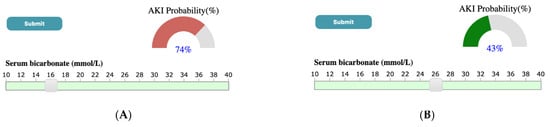(A) Shows how a low serum bicarbonate level is associated with the development of AKI while (B) demonstrates how a normal serum bicarbonate value is less likely to progress to AKI.