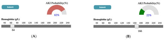 (A) Shows how a low hemoglobin level is associated with the development of AKI while (B) demonstrates how a normal hemoglobin value is less likely to progress to AKI.