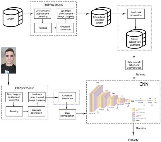 The approach proposed in this paper consists of several stages. First, all of the training images are preprocessed, which is described in more detail in Section 3.1. After preprocessing, the filtered dataset with cropped images is created. Here, the approach for ethnicity classification with plotted landmarks (Figure 1) goes to the landmark annotation step after which a new dataset with annotated landmarks is created. The approach for ethnicity classification without plotted landmarks omits this step and goes to data normalization and augmentation. The steps omitted in the approach without plotted landmarks are marked with purple dotted lines in the Figure 1. The normalized and augmented images are then used to train the CNN. After CNN training and validation, testing is conducted. First part is to input an image which is preprocessed in the same way as training images, then landmarks are annotated (only in the approach with plotted landmarks), images normalized and the trained CNN makes a prediction of ethnicity. Based on the previous research and observation through study of other papers, in which landmarks are not often used in combination with deep neural networks, one of the aims of this paper is to investigate if landmark plotting can contribute to ethnicity classification models.