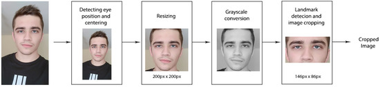 The complete preprocessing stage consists of five steps (Figure 2): (1) eye detection and face centering; (2) resizing the image; (3) grayscale conversion; (4) landmark detection and (5) image cropping.