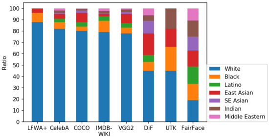 FairFace consists of 97,698 facial images of different people aged 1 to 70 divided into racial groups: White, Black, Latin, East Asian, Southeast Asian, Indian and Middle Eastern. As is for the UTKFace dataset, ethnicity classes are pre-labeled in the dataset. Representation is balanced with about 14% of images for each ethnicity with equal representation of males and females. According to the above figures and the comparison made in the FairFace survey [39], these two data sets are the most balanced datasets observed (Figure 4).