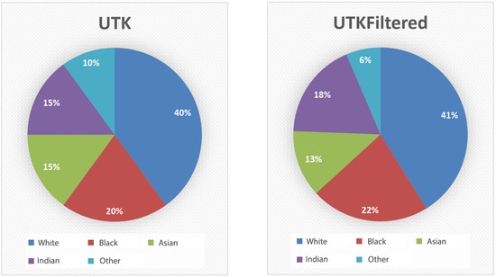 UTKFace consists of 23,807 face images of different people aged 1 to 116 years divided into racial classes: White, Black, Asian, Indian and Others (Middle Eastern, Latin). Those classes are pre-labeled in the dataset and serve as ground truth values for CNN training and performance measures calculation. The representation of ethnicities in the data set is 40% White, 20% Black, 15% Asian, 15% Indian and 10% Other. After preprocessing, UTKFace Filtered contains 18,246 images or 5561 images less than in the original (approximately 23% reduction). The comparison can be seen in Figure 5. The ratio between the ethnicities representations was changed in UTKFace Filtered to 41% White, 22% Black, 13% Asian, 18% Indian and 6% Other.