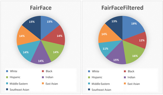 FairFace filtered contains a total of 55,384 images, or 42,314 images less than in the original (approximately 43.3% reduction). Comparison of FairFace and FairFace filtered can be seen in Figure 6. The reason for such a large reduction is that FairFace contains a large number of images taken from a bad angle, images that do not show enough face to detect it properly, modified images that are not in the full RGB spectrum, etc. Such images are not compatible with the aim of this paper that primarily focuses on landmarks and a complete frontal image of the face.
