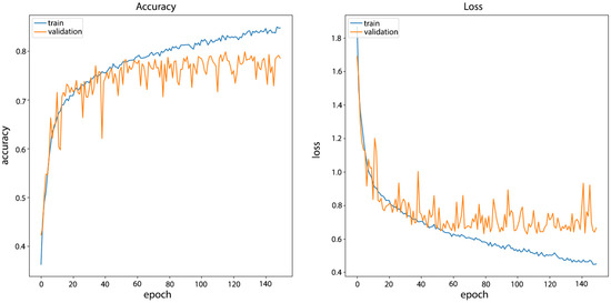 Models without plotted landmarks. The training of the network on the UTKFace filtered dataset (Model_F1) has been done for 150 epochs in order to see the behavior of the network when training for a longer time. The total duration of network training was two hours. Compared to the starting network, better network behavior can be observed on the validation data set. The accuracy of the network after training was 89.78% on the training set and 78.6% on the validation set. The results of network training can be seen in Figure 7.