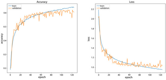 The training of the network on the FairFace filtered dataset (Model_F2) was nine hours and the network had a final accuracy on the training data set of 70.72% with an accuracy on the validation set of 61.84%. In addition, from the graph shown in Figure 8, it can be seen that the curves of the sets are similar, which shows the relatively small difference in accuracy. This validation shows that increasing the number of ethnicity classes negatively affects network performance in training for ethnicity classification. Next, training on the datasets with plotted landmarks will show how the use of face landmarks impacts the results.