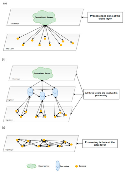 Modern IoT networks often operate in a three-layer architecture consisting of the cloud layer, fog layer, and edge layer [57]. Generally, the cloud layer contains a collection of servers capable of high-performance processing and storage, whereas the fog layer is often identified as an intermediate layer capable of reducing the workload of the devices at the cloud and edge layers [57]. The edge layer often contains devices such as sensor nodes, which are capable of acquiring data. Figure 1 shows these layers as applied to three different architectures.