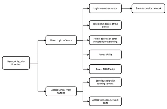 Such security breaches can become harmful since sensors are located in different geographical locations, attached to different home-based private networks. It was found that most of the potential security breaches that could be anticipated in the proposed architecture may primarily occur by directly or indirectly accessing the sensor through outside networks [75]. Successful login to a sensor by a third party could allow a user to (a) gain admin access [75], (b) find IP addresses of other sensors through brute-forcing [76], (c) access the source files, (d) remote login into another sensor [77], and (e) sneak out to an outside network [78]. Figure 3 shows the interconnectivity of the above-mentioned threats.