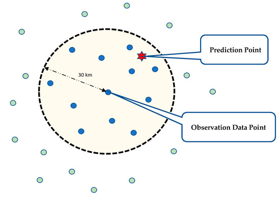 A scenario illustrating how the prediction process of the PLUM ground motion detection algorithm occurs within a circular region of 30 km radius (The red star represents a prediction point and blue dots are the potential observation data points whereas green dots are observation points outside the 30 km range and not involved in the detection process in this particular scenario).