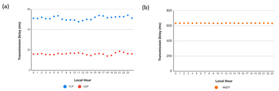 Figure 6a shows the average transmission delay recorded for each hour for a 24-h period for the UDP and TCP protocols, while Figure 6b shows this for the MQTT. When comparing the average transmission delay for a day for all three protocols, UDP outperformed the TCP and MQTT, with an average δttransmission of 16.10 ms, whereas TCP and MQTT reported an average of 51.38 ms and 613.51 ms, respectively.