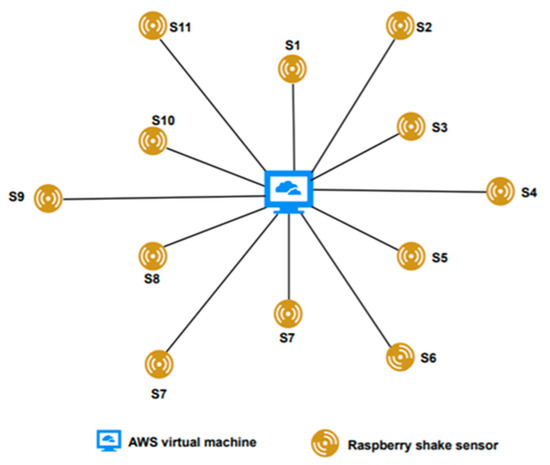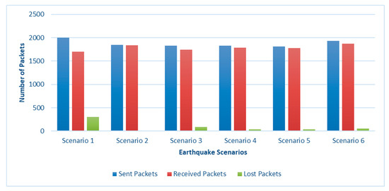 As the next step, for each sensor, time-stamped ground-motion datasets with the calculated S-wave arrival time due to a particular earthquake scenario were programmed into the data simulator installed within the sensor. Thereafter, the pre-programmed data simulator in each sensor were triggered at the exact time when the S-wave (with the velocity of 3 km/s) of each earthquake scenario was expected to reach that particular sensor. For the simulations, we assumed that the earthquake waves travelled as circular waves [41]. For the hypothetical earthquake dataset, we used a ground motion dataset captured by our RS sensor network. Each earthquake scenario was repeated ten times, leading to a total of 60 simulations. After running ten simulations for each scenario, the range of the values obtained for the system latency for all the investigated protocols remained negligible and was in the milliseconds range. Therefore, we decided that it is reasonable to report the average findings obtained for the latency figures for each scenario.