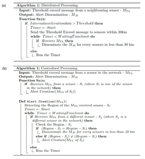 The following link provides access to the GitHub repository containing source code that can be used to implement the EEW sensor network architecture proposed in this paper: https://github.com/rs-networking/Decentralised_Processing_PLUM_V1.0.git (accessed on 20 August 2021)