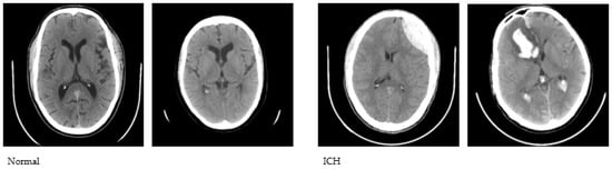 We used the publicly available CQ500 database to conduct this study. The CQ500 dataset [27] includes CT scans of 491 subjects that were employed to construct a Convolutional Neural Network (CNN)-based model for the classification of hematoma subtypes, calvarial fractures, and midline shift in a fully automated fashion. We used a total of 1831 CT images, of which 1000 are healthy and 831 are with hematoma. The CT images were initially converted to JPG format with a 512 × 512 dimension. A sample set of normal and abnormal axial CT images is shown in Figure 1.