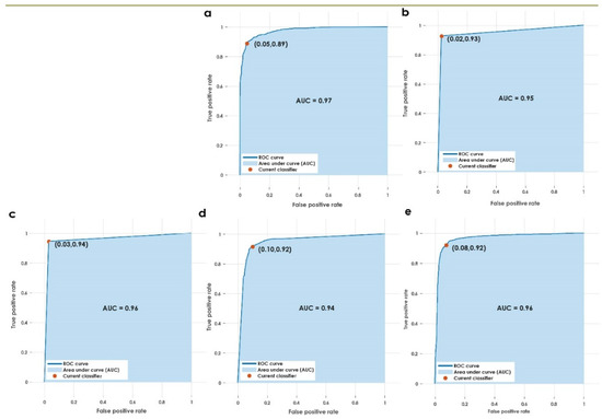 AUC for the various classifiers used in the proposed approach. (a) Weighted KNN, (b) fine KNN, (c) optimizable KNN, (d) wide NN, (e) cubic SVM.