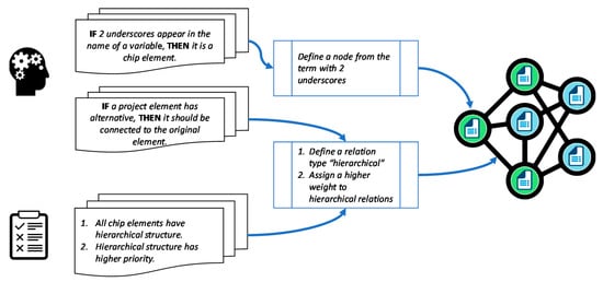 Expert-defined rules are used to reflect the knowledge of domain experts on the construction of the knowledge graph. In the framework, we model the extracted expert knowledge through rules, because they allow a formal representation that supports making a decision about the node types, content, and the graph relations and explanations. An expert-defined rule has an “IF…THEN…” structure. Reasoning with these rules can follow a forward-chaining or a backward-changing approach [,,].