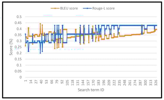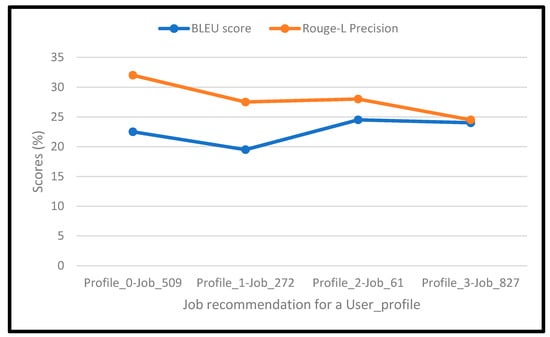 Evaluation of the explainability was conducted through calculating the MEP, BLEU, and Rouge-L scores for the explanations generated for recommended job postings. We achieve an MEP score of 85.6% for the recommended job postings. To calculate BLEU and Rouge-L scores, the user profile and its recommendations’ content are combined for reference, and the generated explanation is fed as a test sentence. The results are shown below in Figure 12 for multiple profiles and job postings. According to [], the BLEU score and Rouge-L precision score are in a good range if they are above 20%, which shows that the generated explanations are related to the recommended job descriptions. Our BLEU score ranged around an average of 23.5%, and the Rouge-L scores ranged around an average of 26%.