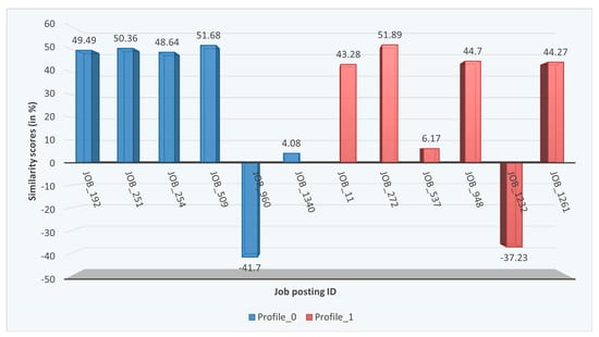 Figure 10 illustrates the cosine similarity scores calculated between two userProfil nodes and multiple jobPosting nodes in the KG. The horizontal axis represents the jobPosting in question, while the vertical axis represents the calculated similarity score. Each userProfile is illustrated in a different color. From Figure 10, it is noticeable that a similarity threshold is needed to determine the creation of a relation in the KG between the jobPosting and the userProfile. Negative scores that appear in Figure 10 are a result of the angle between the document vectors (here 90°). Those scores are considered in their absolute value in the graph relation definition.