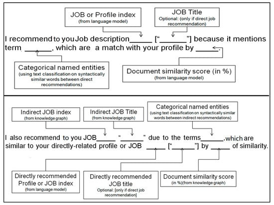 Two templates are used to generate the textual explanations. The first template is designed for direct recommendations, where only the link between the user profile and the job posting is explained. The second template includes information about the intermediate link between the user profile and the job posting, within the transitive relation.