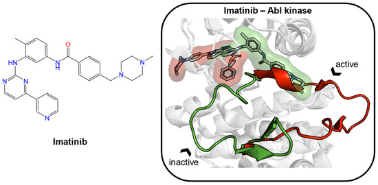 The structure of imatinib is given as an example of an inducer (left). Two crystal structures of Abelson (Abl) tyrosine kinase bound with small-molecule ligands were aligned (PDB ID: 1iep, imatinib, green; PDB ID: 2v7a, PHA-739358, red). In the binding site, the major structural displacement was present in the rotation of the activation loop (residues 381–402 in Abl kinase). Imatinib (green) binds to the preformed pocket and the adjacent subpocket, which is caused by the rotation of the loop.