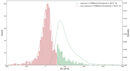 The distribution of two classes of ligands in the PDBbind set (based on optimal threshold = 60 Å3). When the threshold was 0 Å3, the number of pairs that had Vholo − Vapo > 0 Å3 was more than twice those that had a negative change in the volume. This is inconsistent with the common knowledge that the minority of ligands have the ability to induce the opening of the pocket. The optimum threshold, which was determined in this work based on classification model performance, provided a more intuitive separation of both classes of ligands.